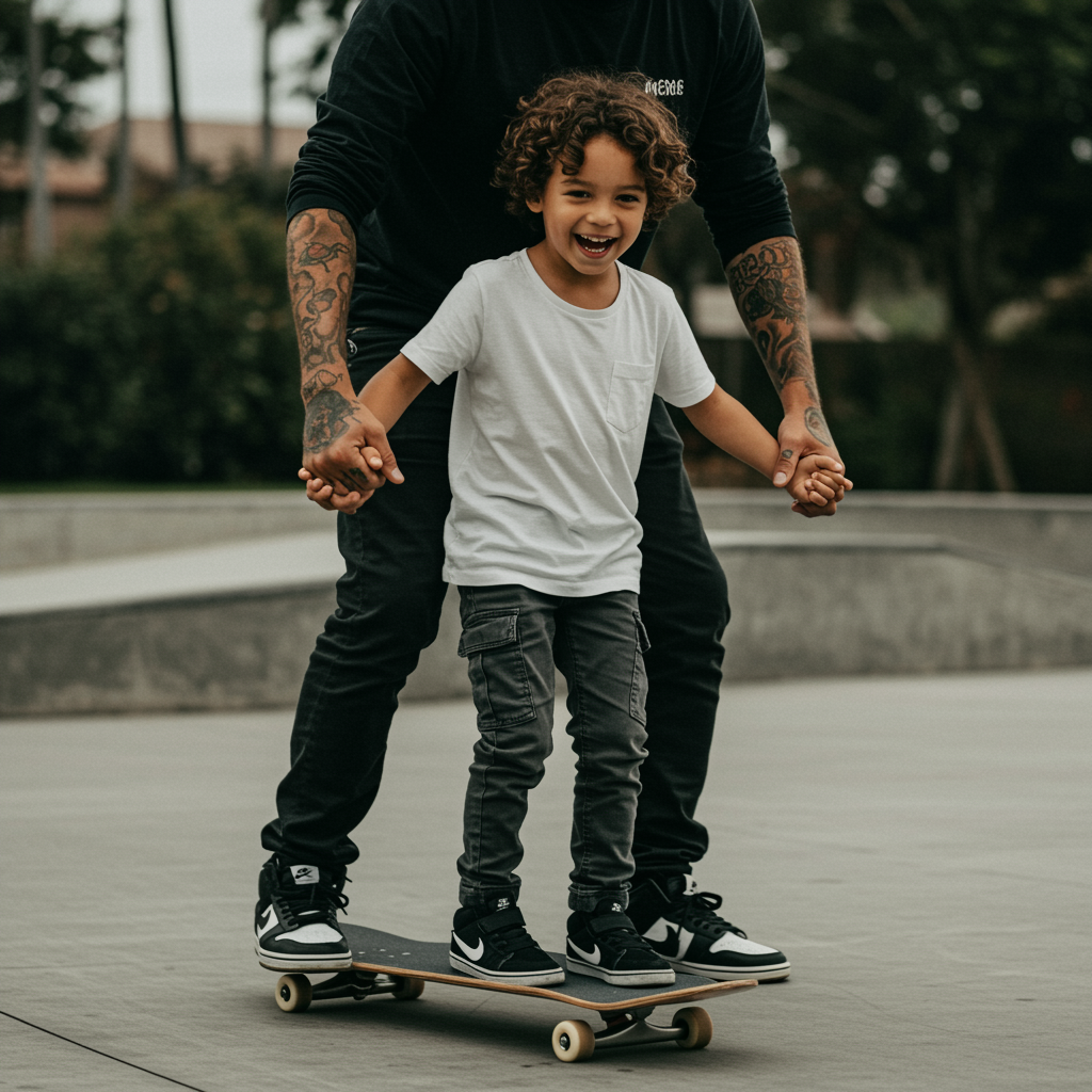 A candid photograph captures a boy and his father, both radiating joy as they navigate a skateboard with ease. The boy, his face alight with a wide grin, wears a white, loose-fit T-shirt that exudes a playful yet cool vibe, paired with dark grey cargo joggers. He confidently grips the tattooed hands of his father, whose lower half is visible in the frame. The father's black, loose-fit long sleeves provide sharp contrast to the colorful tattoos sprawled across his hands. Both are clad in Nike SB skateboard shoes—one pair new and the other comfortably worn—symbolizing a balance of tradition and fresh experience. The shot captures their perfect face-to-body ratio, portraying the shared joy and bonding across generations. The moment is bathed in soft, natural light, using a Sony α9 II camera with a Sony FE 100-400mm f/4.5-5.6 GM OSS lens, lending the image a high-contrast effect that highlights every detail. The serene atmosphere and subtle modifications enhance the core concept of captured happiness, all shot in UHD aspect ratio 9:16 with a raw, stylized touch.