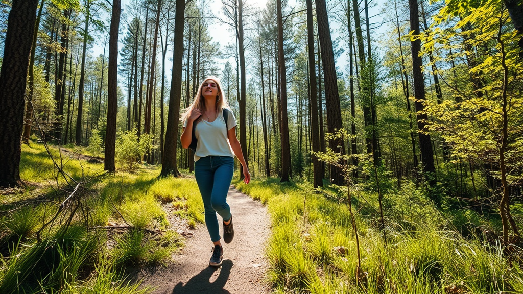 A candid photograph of a blonde social media influencer gracefully navigating a forest trail on a bright, warm day. She exudes a vibrant energy, with sunlight filtering through the trees, casting playful patterns on the ground. Her casual yet trendy attire complements the natural surroundings, adding a touch of modern flair to the rustic setting. The scene captures her genuine appreciation for the outdoors, with lush greenery and a clear blue sky creating a picturesque backdrop for her adventure.