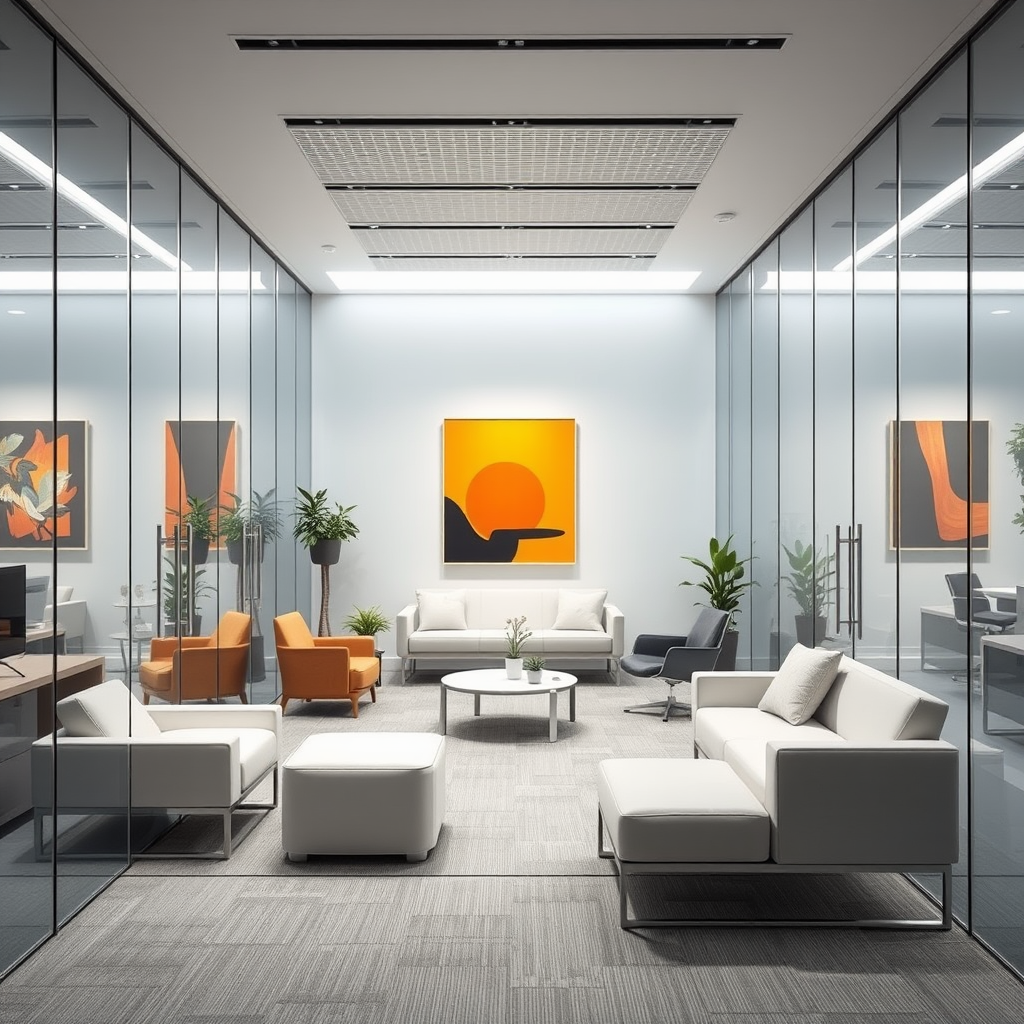 A candid scene captures a modern office space characterized by its minimalist and ergonomic design. Surrounded by transparent glass walls and sleek lines, the environment boasts a neutral color palette enhanced by bold art pieces that inject vibrancy. Studio lighting casts soft, balanced illumination, bringing out the elegance of the contemporary furnishings and open layout.