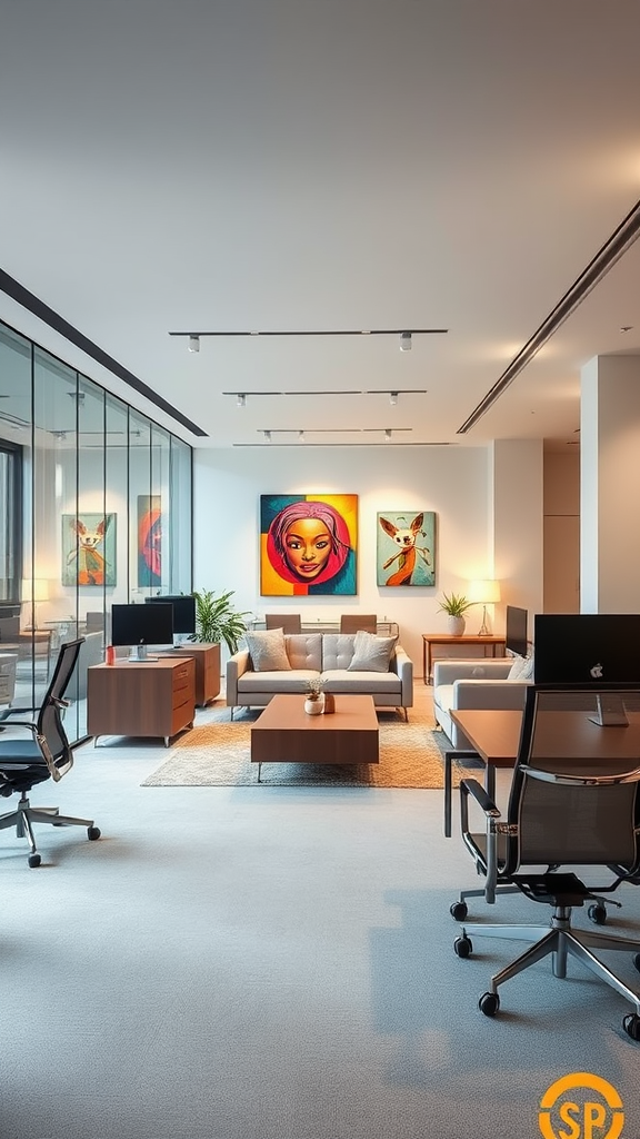 A candid shot in a spacious office with minimalist design elements, showcasing ergonomic furniture against glass walls. The space features sleek lines and a neutral color palette, accented by vibrant and colorful art pieces. Studio lighting highlights the modern furnishings and open layout, creating an inviting and contemporary work environment.