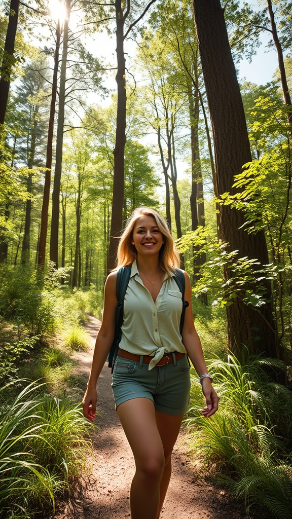 A candid shot of a blonde influencer exploring a vibrant forest on a bright, warm day, her stylish outdoor outfit blending seamlessly with the lush greenery. Sunlight filters through the leaves, casting playful shadows on the forest floor. The influencer's expression is one of awe and serenity, capturing the essence of the moment. Tall trees surround her path, their leaves rustling gently in the breeze, as birds chirp in the distance. The sense of adventure and connection with nature is palpable, making it a truly immersive scene.