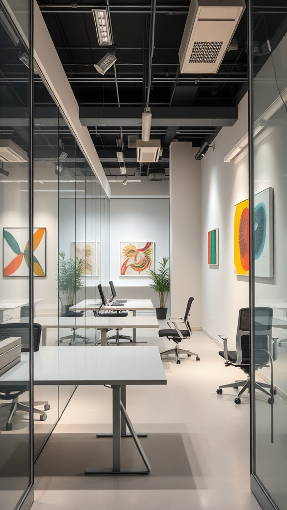 A candid snapshot captures a modern office space featuring minimalist design and ergonomic furniture. The setting is defined by its sleek glass walls and clean lines, creating an open and airy atmosphere. The neutral color scheme is punctuated by vibrant art pieces that add a splash of color and personality. Soft studio lighting enhances the ambiance, creating an inviting and productive environment.