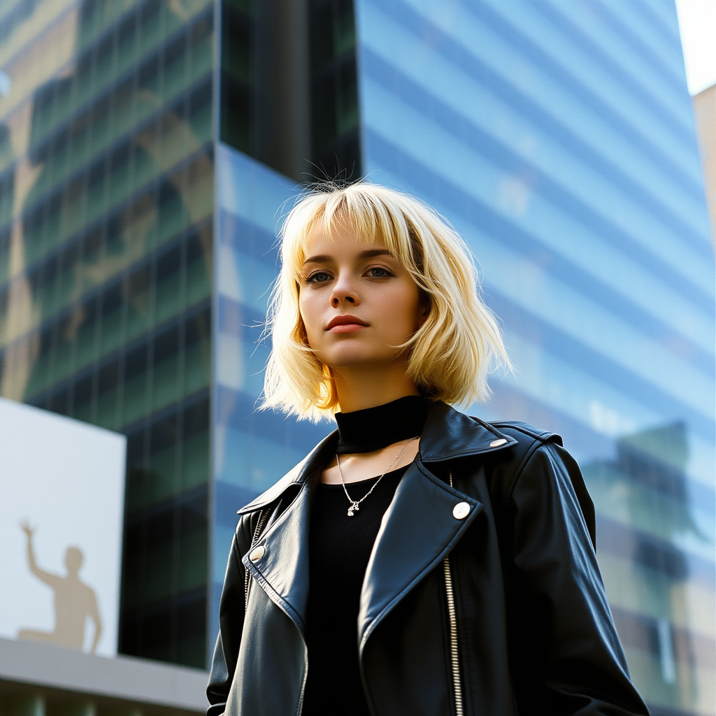 A candid street style photograph capturing a grunge-inspired woman from 1990s Manhattan, posing effortlessly in front of a sleek, reflective high-rise building. Her blonde hair styled in a quintessential 90s bob reminiscent of Carly Norris from the movie Sliver. The natural afternoon light highlights her edgy yet chic ensemble, while the urban backdrop provides a stark contrast. The image is shot with the distinct color tones and texture of Agfa Vista 200 film, capturing the raw vibrancy of the city and her style.
