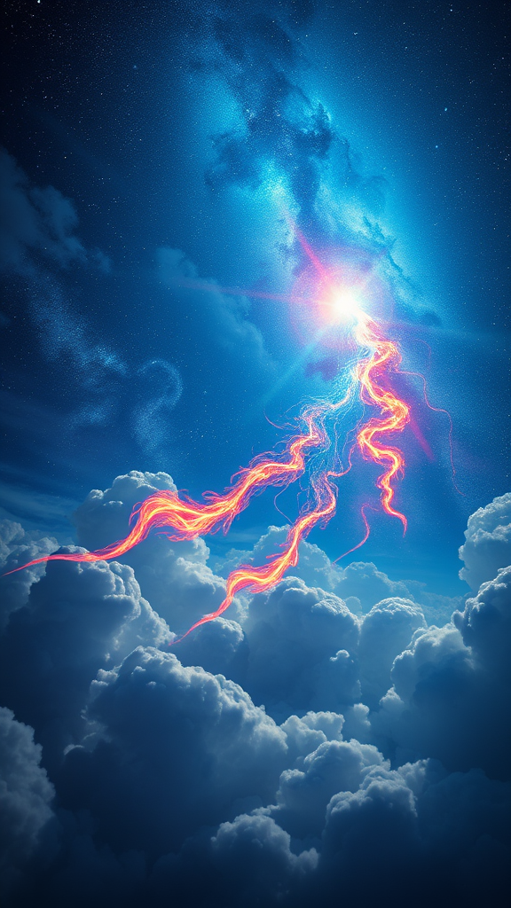 A canvas of sapphire heavens, crowded with wispy cirrus clouds and majestic cumulus behemoths, inspires a sense of reverence and curiosity. A trio of fiery serpents, their tongues aflame with electric blue and scarlet hues, slices through the celestial expanse, leaving trails of ionized gas in their wake. Billowy wraiths, like ethereal spirits, swarm around the tendrils, whispering ancient secrets to the cosmos. Against this dynamic backdrop, a luminous metallic nebula glows like an otherworldly mirror, reflecting the vibrant hues of the fire-wraiths and casting an eerie glow across the sky.