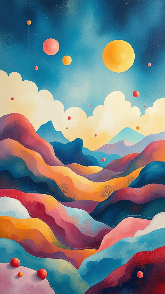 A canvas of whimsical dreams where simplistic shapes float in an ethereal dance, vibrant colors blending harmoniously, evoking a sense of childlike wonder within an abstract surreal landscape, stretching vertically into infinite imagination, the essence of fantasy and reality merging in an elegant, dreamlike symphony.