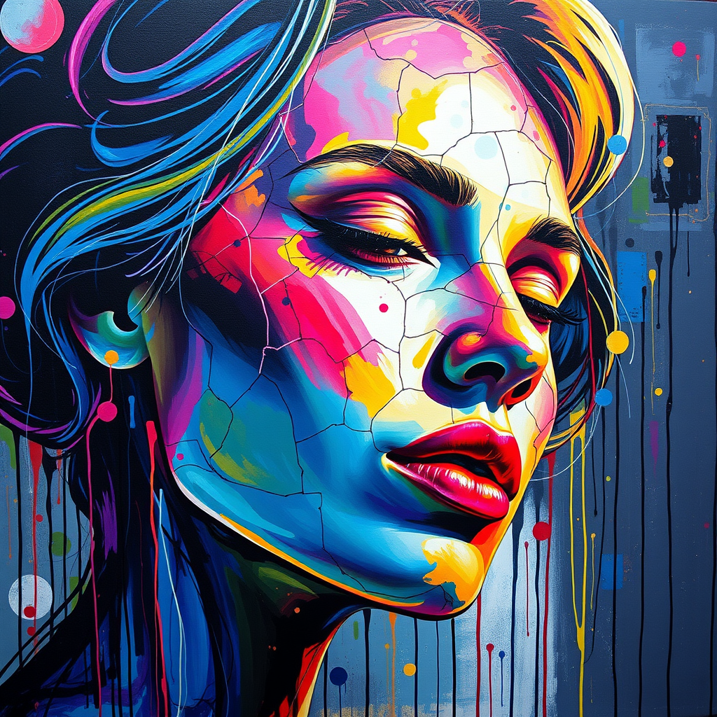 A canvas painting of a woman in vivid and colorful hues, inspired by the style of Martin Ansin, featuring serene faces with a cracked effect, echoing the artistry of Dimitry Roulland. The piece employs a paint dripping technique with stunning colors and incorporates geometric elements to enhance the composition.