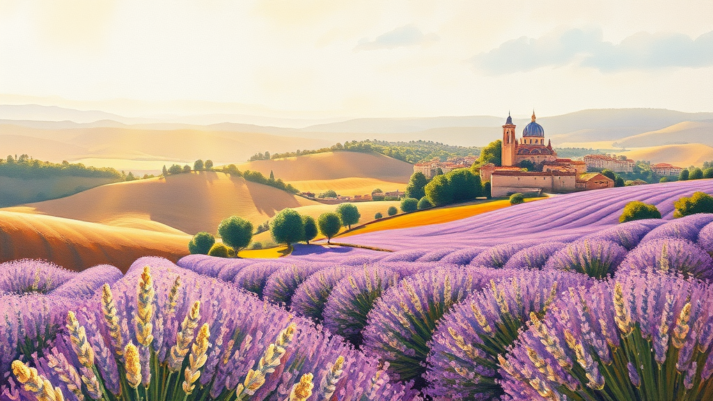 A canvas painting showcasing the serene landscape of Provence, capturing the light and essence of the region with gentle, flowing brushstrokes reminiscent of impressionist masters. The composition bathes in a palette of warm, golden hues, where fields of lavender meet sunlit hills, and quaint villages peek through, inviting a sense of tranquil beauty and timeless charm.
