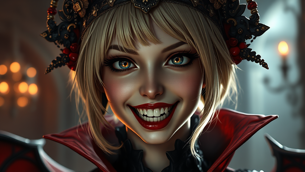 A captivating 4k digital painting of a female Dracula with a cute yet mischievous expression, featuring sharp teeth and short blonde hair adorned with ornate headgear. The setting reflects a trendy vampire horror movie style, reminiscent of Coppola's Dracula, incorporating artistic influences from Artgerm and Greg Rutkowski. The composition showcases a cinematic quality, combining highly detailed, realistic elements with dramatic shadows and intricate textures. This hyper-realistic portrayal is enhanced with dynamic rim lighting and rich shadows, emanating a dark, mysterious atmosphere. The ultra-detailed visual offers overcast reflection mapping, movie-quality VFX, and sophisticated color gradation, akin to a high detail RAW color photograph shot on a Nikon Z9 with Unreal Engine 5’s advanced rendering and Redshift's realistic lighting effects. The image captures an epic, award-winning photorealistic essence, boasting ultra high definition and the immersive depth of an 8k resolution, perfect for a cinematic, spotlight-focused, concept art piece.