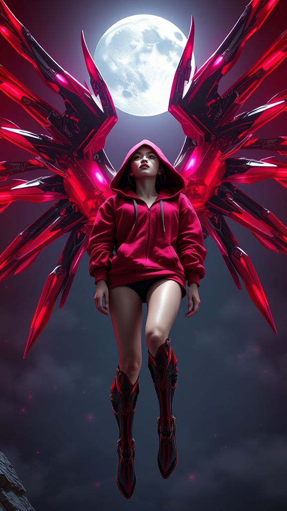 A captivating adult woman undergoes a stunning transformation into a mecha inspired by Evangelion Demonic Demon themes, ascending gracefully towards the moon. Her eyes are a mesmerizing combination of beauty and mischief, reflecting both evil and charm. Clad in a burgundy red hoodie, she embodies a perfect blend of angelic and devilish features, with elaborate mega robotic wings that shimmer with metallic hues. Her elegantly sculpted legs contribute to her full-body allure, enhanced by intricate details that highlight her exquisite form. The scene is rendered with luminism, capturing the essence of a masterpiece with a three-dimensional effect using advanced 3D and octane rendering techniques. This isometric view showcases an array of vibrant colors, set against a backdrop of neon lighting, presented in stunning 8k resolution, creating an awe-inspiring visual narrative.