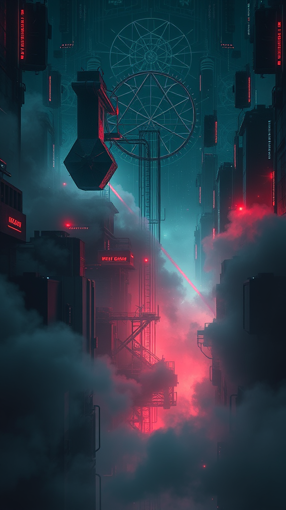 A captivating album cover design featuring a fusion of techno and dark elements, evoking a sense of mystery and introspection. The imagery combines deep, shadowy hues with intricate geometric patterns and pulsating neon accents, resembling a futuristic cityscape at night. Ethereal mist swirls around, drawing the viewer in, creating an atmosphere of infinite depth and curious exploration, inviting the imagination to wander and absorb the enigmatic sounds within.