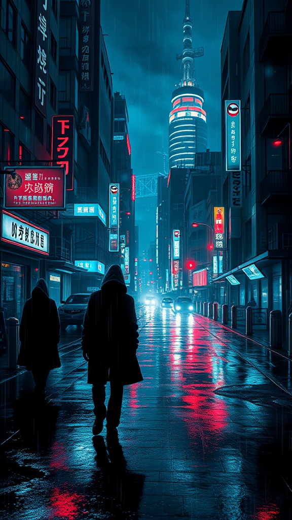 A captivating album cover design featuring a futuristic cityscape at night, illuminated by neon lights reflecting off rain-soaked streets, with shadowy figures cloaked in mystery blending into the urban landscape, evoking a sense of intrigue and anticipation, accented by abstract digital patterns weaving through the scene, creating a dark and immersive techno aesthetic.