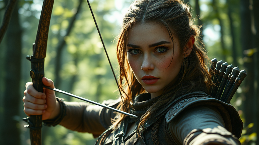 A captivating and alluring female archer adorned in intricately detailed leather and cloth attire, standing amidst an enchanting woodland scene, exuding a sense of mystery and strength, with a hint of fantasy. Her eyes, piercing with determination, catch the dappled sunlight filtering through the canopy. The image is rendered in ultra-high detail, with a sharp focus that captures every texture and nuance, enhanced by cinematic lighting that creates dramatic contrasts. The scene evokes the depth and realism of an octane render and unreal engine, complemented by the nostalgic touch of film grain, entwined with a hint of ethereal essence.