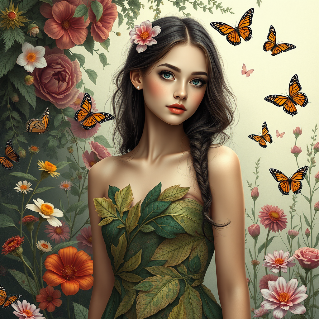 A captivating and artistic representation of a Russian girl with a slender body, adorned in a leaf dress, surrounded by flowers, butterflies, and plants. The scene embodies a beautiful aesthetic with intricate and super fine detail, rendered in a vintage style. It is vivid, colorful, and minimal, capturing a dynamic composition. The image is h in UHD, HDR, and 8K quality, emphasizing her elegant eyelashes and natural grace. The setting radiates an aura of fantasy and creativity, akin to a timeless artwork, ensuring clarity and focus throughout. The scene is flawlessly composed, avoiding any disfigured, mutated, or distracting elements, maintaining its elegance and visual harmony without any unwanted distortions or blemishes.