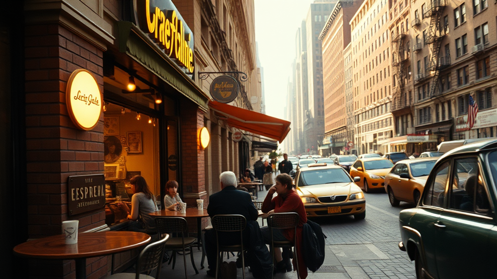 A captivating and atmospheric 1970's New York street cafe scene, captured in a nostalgic and cinematic manner, evokes the essence of the golden age of film photography. This vintage tableau presents the lively urban vibe, with patrons savoring their espresso at outdoor tables, framed by the movement of classic cars and timeless architecture. Shot with a Leica M3 rangefinder camera and a Summicron 35mm f/2 lens, celebrated for its exceptional sharpness and gorgeous color rendition, the photograph employs Kodak Portra 400 film, which provides a warm and timeless color palette that enriches the ambiance. With a shallow depth of field set at f/2.8, the cafe and its patrons are beautifully isolated from the energetic city backdrop. The ISO remains at 400, and the shutter speed is at 1/125 sec, achieving a harmonious capture of light and motion. The composition is further enhanced by the gentle, diffused sunlight filtering through the iconic skyline of New York, casting golden hues across the scene and illuminating the intricate textures of the brick facades and cobblestone streets.