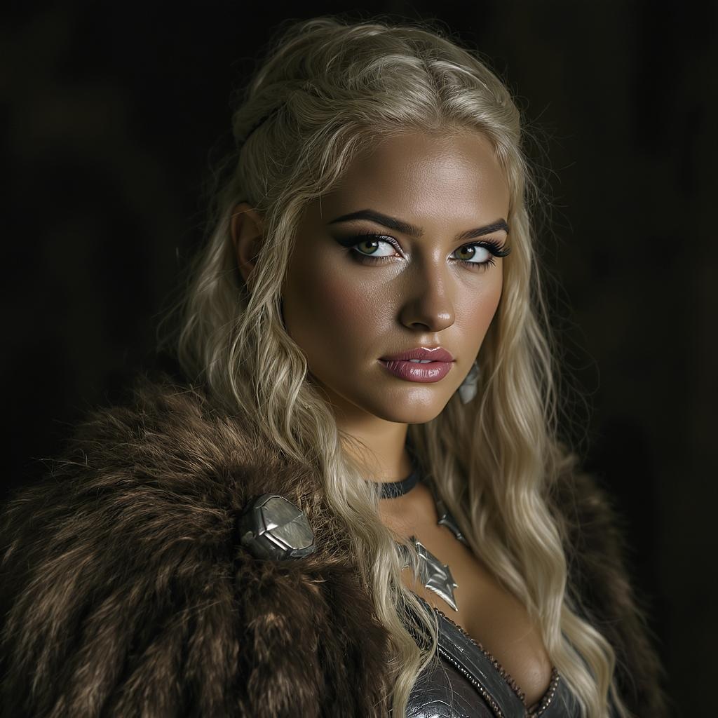 A captivating and detailed portrait of a striking modern female Viking, captured with an intimate and realistic approach. The composition utilizes soft natural and dramatic lighting, reminiscent of magical photography, using an 85mm lens for authentic portrait photography. The portrayal is ultra-detailed, focusing on creating a sense of depth and realism. The atmosphere is enhanced by the use of Cinestill 800T film, lending a unique texture to the image. Despite low-resolution elements, the portrait maintains a sense of raw beauty and authenticity, avoiding digital imperfections such as JPEG artifacts, misaligned anatomy, or unwanted errors. This image strives to depict the powerful elegance of a Viking woman without compromising on artistic integrity or falling into visual distortions that could detract from its captivating essence.