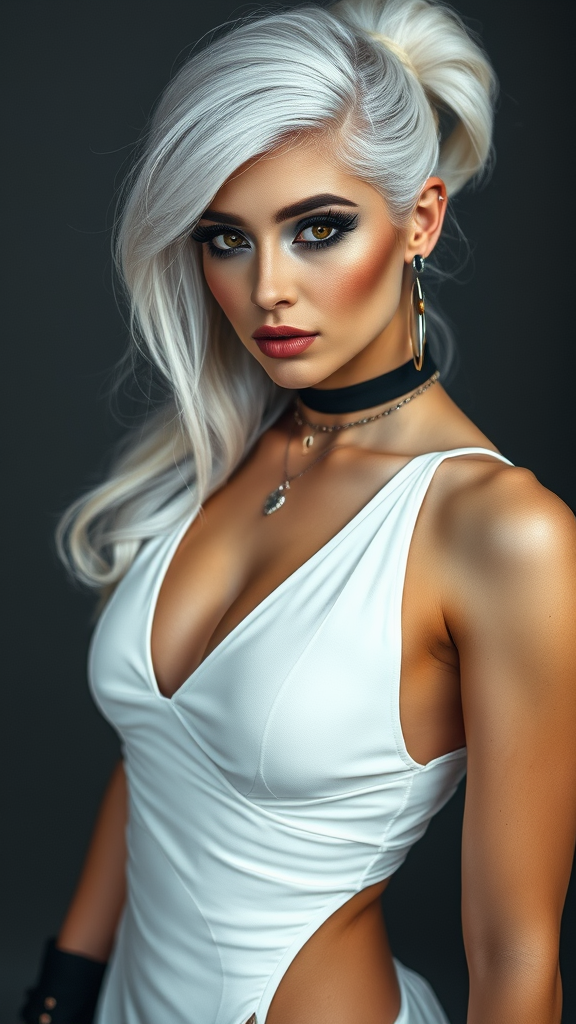 A captivating and enchanting woman reminiscent of Smurfette from the Smurfs, exuding beauty and charisma, adorned with piercings and showcasing an athletic physique. She wears an elegant white dress that highlights her gorgeous figure, featuring intriguing and unique shapes. Her full-body portrait embodies a goth style, with her alluring dark eyes serving as a focal point. Inspired by the artistic touch of Jessica Drossin, this life-size depiction is captured in 8k sharp focus, offering highly detailed, photorealistic imagery that brings the character to life.