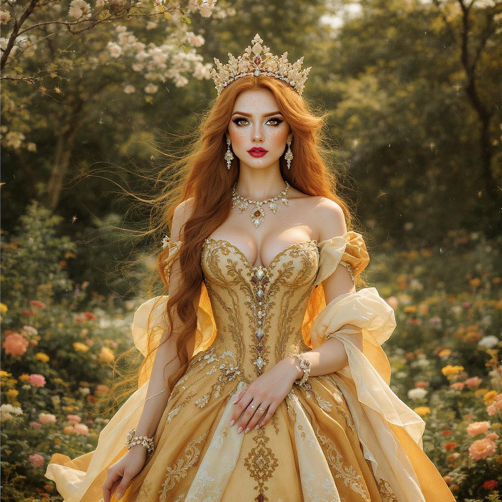 A captivating and ethereal depiction of a regal woman with perfect female anatomy, adorned in an exquisite ginger-hued dress inspired by bridal and royal attire, featuring intricate detailing and embellishments. Her ensemble includes elegant earrings, lavish jewelry, and a stunning crown or tiara. Set against the enchanting backdrop of a lush forest or open field filled with vibrant flowers and natural beauty, her strikingly beautiful eyes captivate the viewer. The scene is a full body, standing portrait that showcases hyper details with volumetric lighting, achieving an epic and cinematic quality. This image is rendered in extremely high detail with elements of film grain, giving it a 3D, redshift style with the finesse of an illustration, oil painting, and portrait art. The subject is a striking redhead with freckles and very long hair, creating a visual masterpiece suitable as a wallpaper, characterized by vivid creativity and elegant artistry.