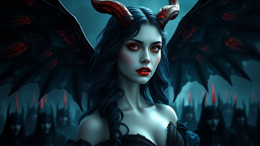 A captivating and ethereal vision emerges: a beautiful, sensuous woman with porcelain white skin and dark blue hair cascading around her elegant features. Her crimson red eyes, like fiery rubies, exude a mesmerizing, charismatic charm that is both alluring and intimidating. She is the epitome of a queen vampiress, adorned with striking jet-red horns that curve gracefully, symbolizing her regal power. Six majestic arching wings surround her like an ominous halo, commanding an army of devoted vampires who solemnly bow in reverence. The scene is set in a morbidly gothic, dense, atmospheric landscape—a realm of shadows and mystery. The air is thick and wet, enhancing the sense of foreboding drama. This enigmatic figure exudes a powerful femme fatale allure, her red lips a bold statement of her passionate, dangerous nature. Every detail of this epic tableau is incredibly realistic, enhanced by photorealistic rendering and volumetric lighting that creates an otherworldly glow. The hyperornate surroundings add to the eerie glamour of the scene, capturing a hypermaximalist aesthetic that showcases an unreal, dramatic intensity, reminiscent of the most sophisticated cinematic experiences.