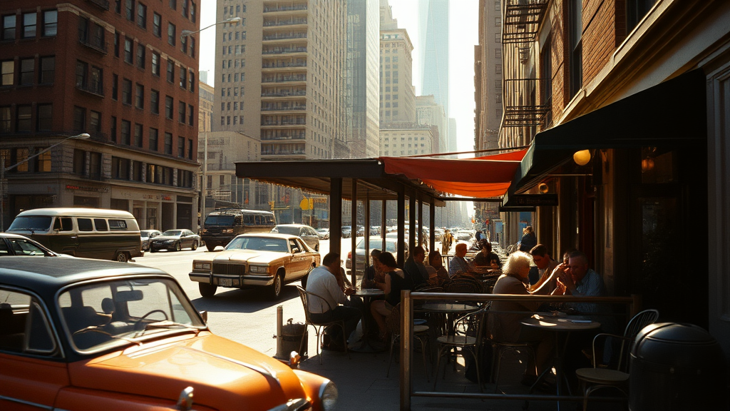 A captivating and evocative 1970s New York street cafe scene captured in a nostalgic, cinematic style, reminiscent of the classic era of film photography. This vintage tableau features lively urban life, with patrons savoring their coffee at outdoor tables, surrounded by the motion of vintage cars and iconic retro architecture. The photograph is expertly composed, using a Leica M3 rangefinder camera with a Summicron 35mm f/2 lens, celebrated for its clarity and exquisite color rendition. Shot on Kodak Portra 400 film, this image boasts a warm, enduring color palette that amplifies the ambiance. The photographer skillfully applies a shallow depth of field with an aperture of f/2.8, setting the cafe and its patrons apart from the dynamic cityscape. The ISO is set to 400, and the shutter speed is 1/125 sec, achieving an ideal balance of light and movement. The composition is enriched by soft, diffused sunlight streaming through the storied New York skyline, casting golden tones across the scene, accentuating the rich textures of brick facades and cobblestone streets, inviting viewers to step back in time.