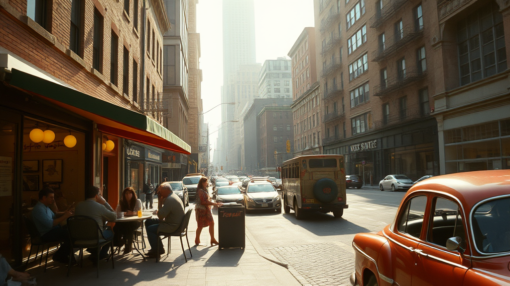 A captivating and evocative scene of a 1970s New York street cafe is captured in a nostalgic and cinematic style, reminiscent of the classic era of film photography. This vintage vista depicts the vibrant urban life, with patrons sipping coffee at outdoor tables, surrounded by the motion of vintage automobiles and retro architecture. The photograph is artfully composed, using a Leica M3 rangefinder camera coupled with a Summicron 35mm f/2 lens, famous for its sharpness and exquisite color rendering. The image is shot on Kodak Portra 400 film, imparting a warm and timeless color palette that enhances the mood. The photographer skillfully applies a shallow depth of field with an aperture of f/2.8, beautifully isolating the cafe and its patrons from the bustling cityscape. The ISO is set to 400, and the shutter speed is 1/125 sec, achieving an ideal balance of light and motion. Composition is enriched by the soft, diffused sunlight streaming through the iconic New York skyline, casting warm, golden hues over the scene and highlighting the rich textures of the brick buildings and cobblestone streets.
