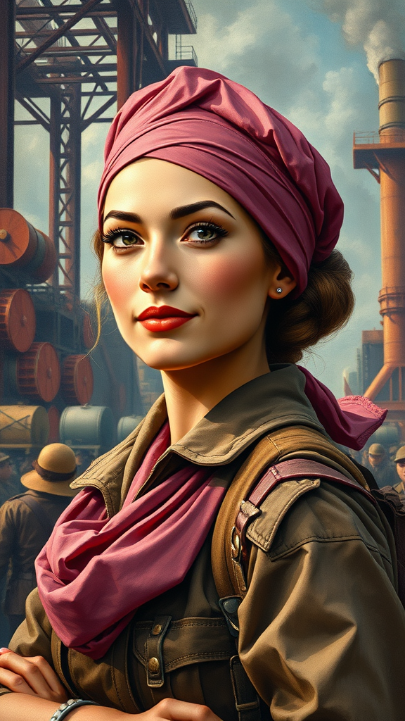 A captivating and intricate masterpiece of Socialist Realism, portraying a woman exuding strength and determination, adorned with a pink bandana and hat. The painting draws inspiration from Alexander Deyneka’s iconic Soviet style, featuring robust, dynamic angles and vibrant lighting that enhances the vivid realism of the scene. The woman stands amidst a bustling, idealized industrial backdrop, embodying the spirit of progress and unity. Her expression is focused and serene, with a subtle smile hinting at resilience and hope. Rich, earthy tones form the color palette, contrasted with splashes of bright hues to highlight the central figure. The overall composition creates a sense of motion and vitality, as if the painting itself is alive with the energy of the era.