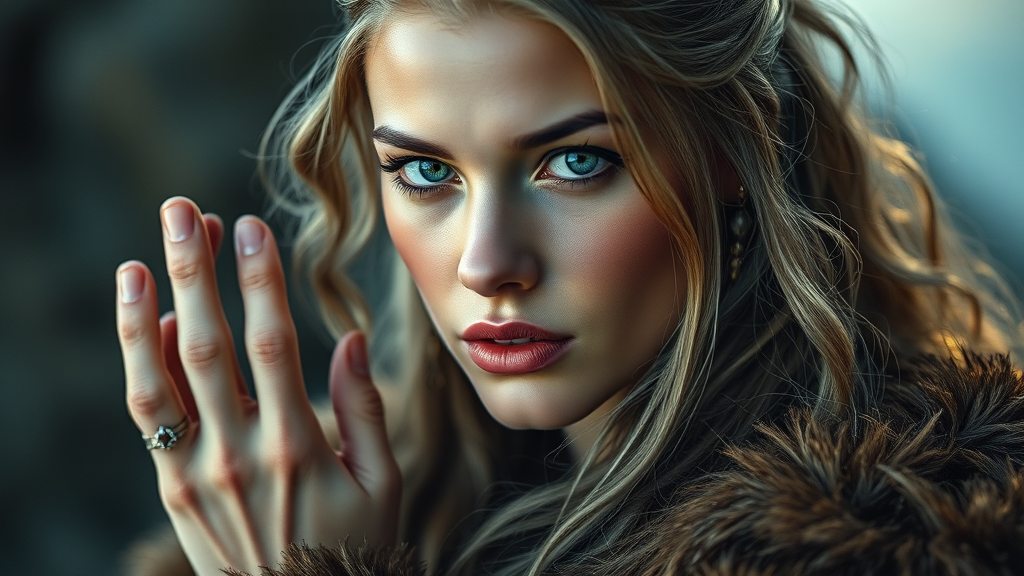 A captivating and lifelike portrait of a stunning modern female Viking, captured with soft, natural lighting and the keen eye of portrait photography. Shot with an 85mm lens, this magical photograph uses dramatic lighting and photorealism to deliver an ultra-detailed, intimate composition. The image evokes the essence of Cinestill 800T film, embracing its low resolution and characteristics. It explores themes of textural imperfections, such as jpeg artifacts, and includes unexpected elements like missing or extra digits, cropped framing, and unusual anatomy. This portrait balances beauty and the surreal, with features like extra limbs or fingers, poorly drawn hands and feet, disfigured and out-of-frame elements, tiling effects, and intentional deformities. Embracing blurriness, fuzziness, and misshaped appearances, the subject exudes an alien elegance that transcends traditional beauty. Watermarks blend seamlessly into the visual narrative, adding to its unique allure.