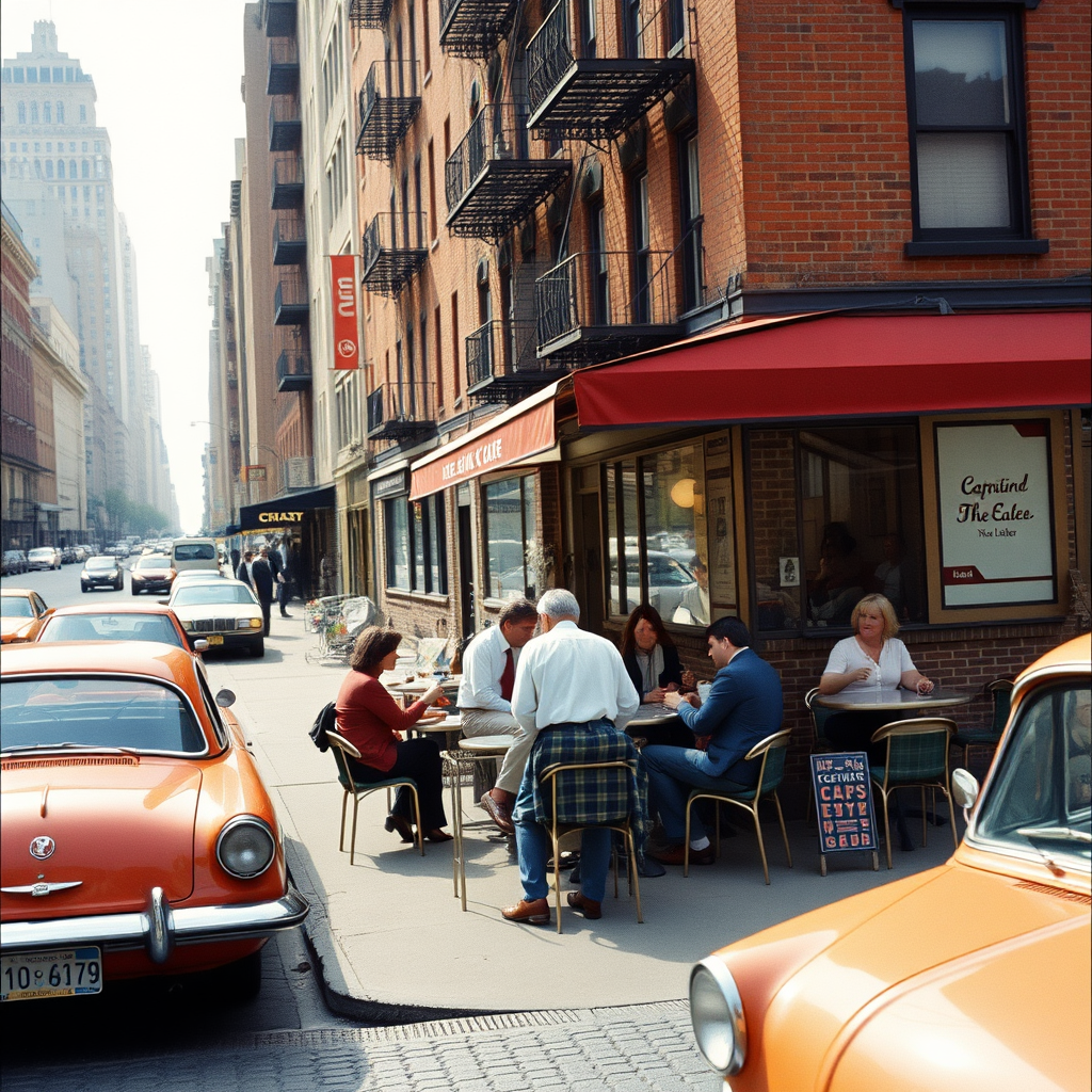 A captivating and nostalgic 1970s New York street cafe scene unfolds with a cinematic flair, reminiscent of the era's classic film photography. This vintage image captures the vibrant urban life, as patrons savor their espresso at outdoor tables, surrounded by the flow of classic cars and charming retro architecture. Taken with a Leica M3 camera paired with a Summicron 35mm f/2 lens, known for its crisp sharpness and exquisite color rendering. The photograph employs Kodak Portra 400 film, offering a warm and timeless color palette that enhances the nostalgic ambiance. The photographer artfully uses a shallow depth of field at f/2.8, focusing on the cafe and its lively patrons while artfully blurring the bustling city backdrop. The ISO is set to 400, with a shutter speed of 1/125 second, capturing the ideal blend of light and motion. Soft, diffused sunlight filters through New York's iconic skyline, bathing the scene in warm, golden hues, and accentuating the rich textures of the brick buildings and the cobblestone streets below.