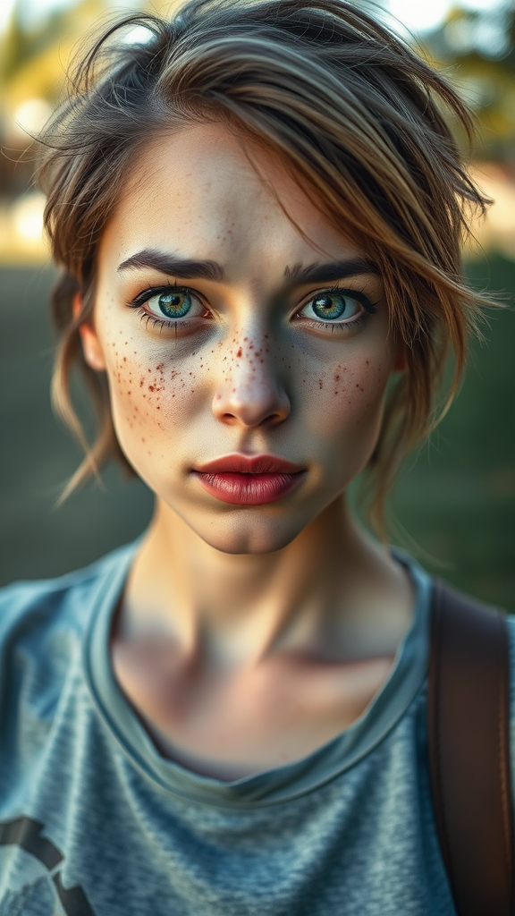 A captivating and ultra-detailed portrait of a woman with a scattering of freckles, wide expressive eyes, and short tousled hair, captured outdoors. She dons a simple gray t-shirt, gazing intently into the camera, her lips slightly chapped, bathed in gentle and natural light. The portrait showcases an enchanting blend of magical and dramatic lighting, emphasizing a photorealistic and intimate composition. Shot with a Leica 50mm lens at f1.4, the image combines subtle creativity with rich detail.