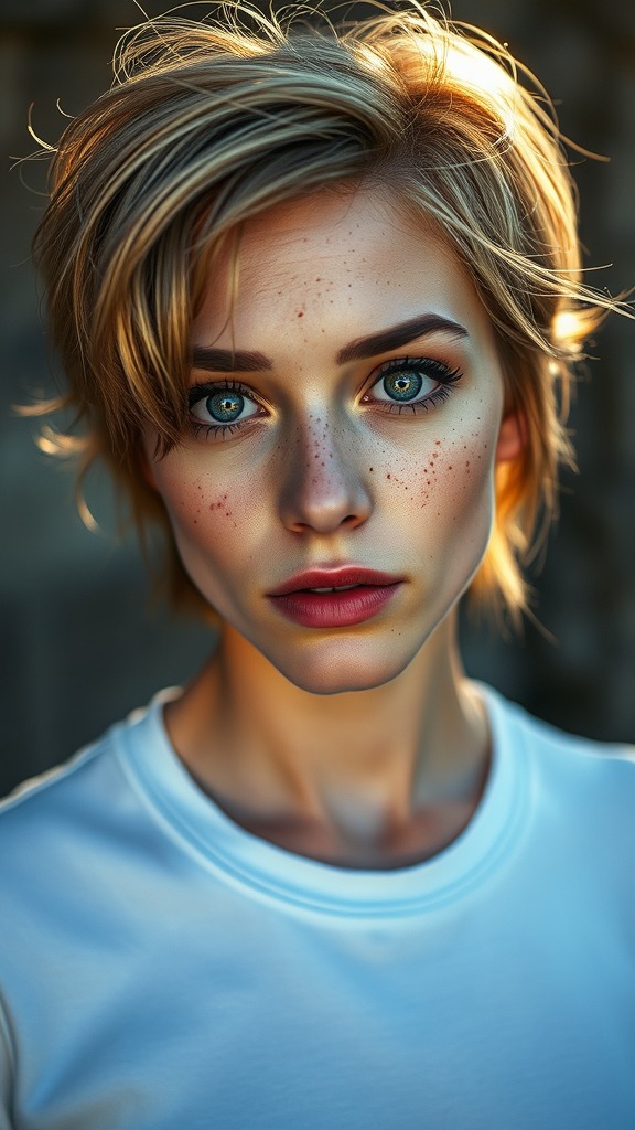 A captivating and ultra-detailed portrait of a woman with a sprinkle of freckles, expressive round eyes, and short tousled hair, captured outdoors. She wears a simple white t-shirt and gazes directly into the camera with chapped lips, exuding a natural charm. The soft, natural lighting enhances her features, creating a magical yet realistic atmosphere. The dramatic light play adds depth and intimacy, reminiscent of a Leica 50mm, f1.4 shot. Subtle creative touches bring out her unique essence, making this portrait a blend of realism and artistry, with a focus on an intimate and authentic composition.