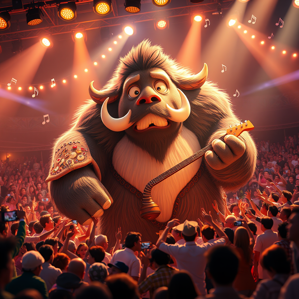 A captivating animation key shot of an enormous, gentle band behemoth playing passionately on stage, surrounded by a vibrant, adoring crowd. The scene captures a medium shot, blending Studio Ghibli's whimsical charm, Pixar's emotive storytelling, and Disney's enchanting style, all brought to life in intricate 3D detail. Rendered in Unreal Engine 5, the setting features sharp, vivid colors and textures. Inspired by the anime key art of Greg Rutkowski, the image is enveloped in a soft, magical bloom, with dramatic lighting accentuating the behemoth's expressive eyes and the movement of its lumbering yet graceful gestures. The stage is set with ethereal lights that dance around, creating a dreamlike atmosphere, while musical notes seem to float in the air, adding to the scene's harmonious and heartwarming feel.