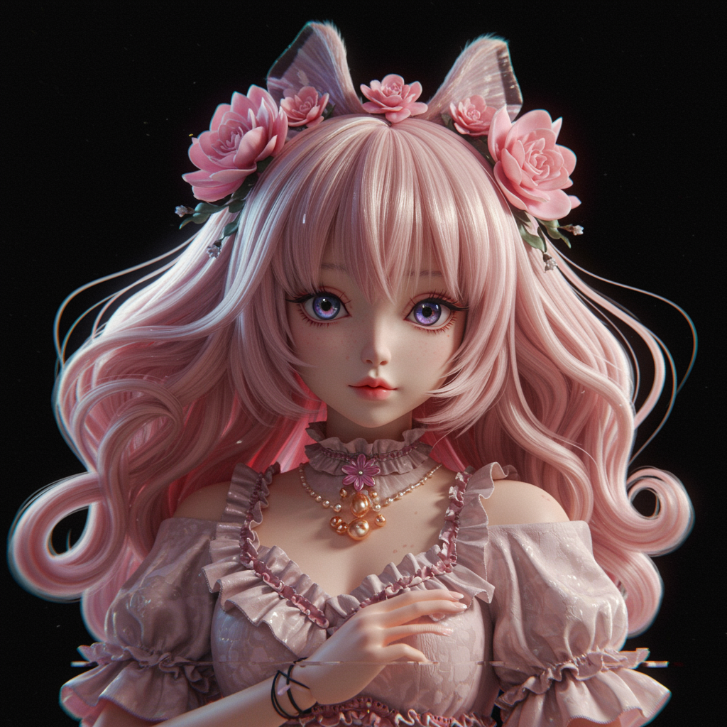 A captivating anime girl rendered in thick acrylic style, reminiscent of an oil painting, showcases stunning iridescent reflections and delicate flower adornments. The use of chiaroscuro and holy cinematic rim lighting gives the piece a dramatic flair, evoking the elegance of rococo art. Crafted with CGI techniques, the 3D doll-like figure, generated via octane render, follows a low-resolution aesthetic with intentional text and error effects. Although it features cropped and imperfect elements, the piece includes visual artifacts such as duplicate imagery and deliberate distortions. The portrayal features exaggerated anime proportions, with attention to texture and morphology, resulting in a surreal, avant-garde depiction that explores the boundaries of traditional beauty through its unconventional anatomy and composition.
