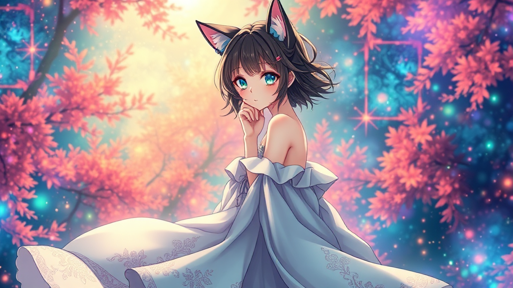 A captivating anime-style image showcases a woman with cat ears, her enchanting eyes mirroring the vibrant hues of the colorful background. She stands gracefully in a flowing dress, each fold and fabric detail exquisitely rendered in 4k resolution. The scene is richly detailed, similar to the enchanting fantasy worlds depicted by Yuumei, and echoes the mystical essence found in Onmyoji artwork. The blend of intricate patterns and vivid colors creates a stunning visual experience, embodying the beauty of anime fantasy illustration.