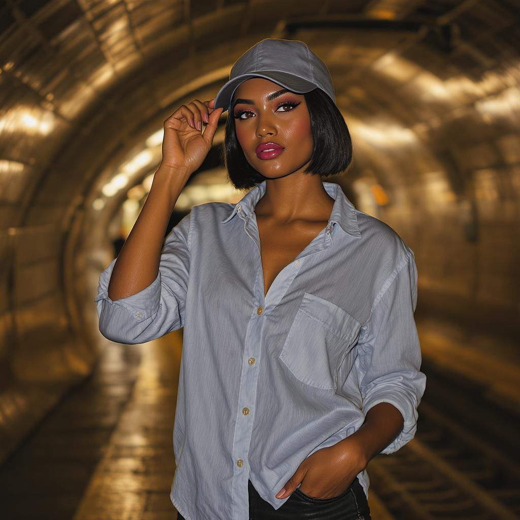 A captivating architectural photograph captures a 24-year-old Tongan-Kikuyu woman, a graceful swimmer, exuding warmth and approachability. Her caramel skin radiates a beautiful glow, subtly shimmering as it catches the ambient light. With delicate makeup, she sports a touch of blush on her cheeks and a natural pink hue on her lips, her skin's texture vividly detailed. Her thin crescent eyes, a striking topaz shade, sparkle beneath long, elegant lashes. The model's chic blunt bob frames her face seamlessly, her neatly groomed eyebrows accentuating her refined features. She wears a stylish button-up shirt, revealing just a hint of her midriff above biker shorts. Striking a thoughtful pose, she adjusts a cap with one hand while the other rests casually in her pocket. Carefully composed using the rule of thirds, the scene unfolds against the dynamic backdrop of a subway station, with its ambient lights softly diffused by clamshell lighting. The entire composition is bathed in a candle-like glow, reflecting the atmospheric style of Miko Lagerstedt, adding a touch of poetic intimacy to the shot.