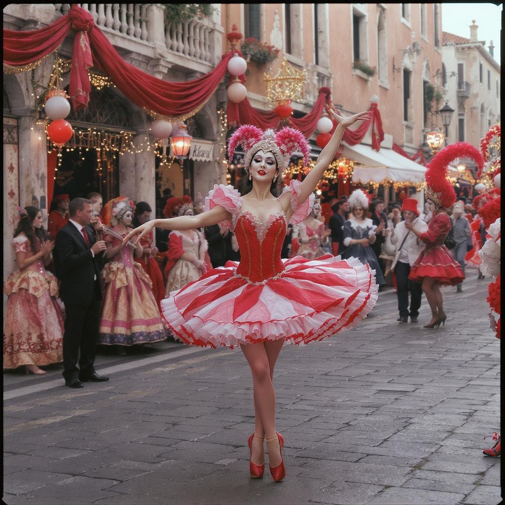 A captivating ballerina, a beautiful woman exuding elegance, moves gracefully in a harlequin-inspired costume at a vibrant Venetian carnival. Her dance is captured with the warm, nostalgic tones of Kodak Portra 800, showcasing photographic realism and ultra detail. The image is composed with a 9:16 aspect ratio, immersing the viewer in the enchanting atmosphere of this expressive and colorful celebration.
