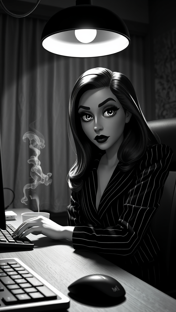 A captivating black and white film captures the essence of a 1940s noir detective, the most beautiful private investigator in the world. The scene focuses on her detailed, symmetrical face and dark reflective eyes. Her long, shiny hair falls gracefully as she sits at a desk, a steaming cup of coffee in hand. The dramatic, high-contrast lighting highlights her pinstripe trousers and the dust particles dancing in the air, creating an atmospheric setting. The ceiling lamp casts a perfect rim light, accentuating her classic makeup. The room features elements like a keyboard and mouse, adding a slightly modern twist to the vintage aesthetics. The depth of field is shallow, maintaining focus on her expressive gaze while the background softly blurs. Though the scene maintains its timeless noir charm, there are unique, subtle updates to the style, blending cartoonish elements and a hint of 3D, while ensuring everything remains elegant and proportionate.