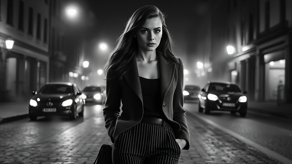 A captivating black and white film stock scene capturing the essence of a 1940's noir detective woman, exuding elegance and mystery as she strides down a fog-laden street. Her long, shiny hair and dark reflective eyes set against a high contrast backdrop evoke the era's classic charm. She is dressed in pinstripe trousers and a tailored tweed jacket, with dramatic rim lighting accentuating her silhouette. Mist swirls around her, and dust particles dance in the dramatic lighting. Streetlights cast moody shadows on the cobblestones, as her poised figure, complete with freckles and immaculate makeup, draws you into the cinematic moment. The shallow focus and depth of field create a timeless atmosphere, while modern cars blend seamlessly with the vintage setting. Perfectly executed, this portrayal frames the detective with a sense of refined allure, embodying a world of mystery and enigma.