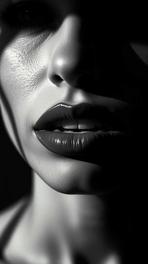 A captivating black and white image focuses on the alluring lips of a striking woman. The play of deep shadows brings out a high-contrast aesthetic, perfect for an elegance-driven fashion magazine cover. This image embodies minimalist charm with a modern twist, exuding an artistic and iconic vibe. Simple yet powerful, the photograph holds a mysterious allure that is both beautiful and stylish, capturing attention with its refined and stylized presentation.