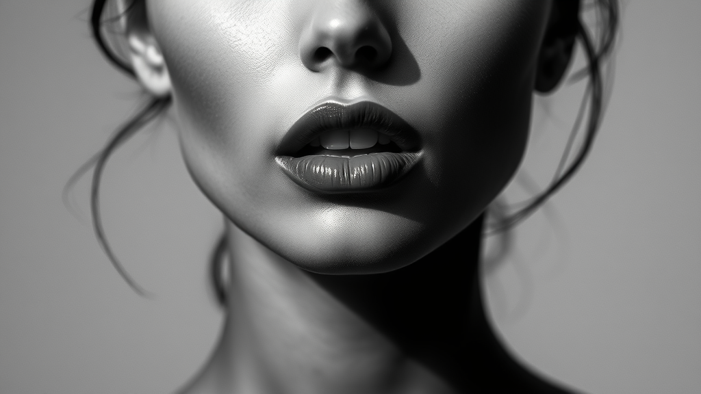 A captivating black and white photograph showcasing the portrait of an alluring woman, with emphasis on her lips, dramatically highlighted by deep shadows. Crafted for fashion magazine covers or advertising, this image embodies high contrast and minimalist elegance, exuding a sense of mystery and modernity. With an artistic and iconic flair, the style is elegantly simple yet striking, offering a beautiful and powerful visual narrative in the spirit of minimalism. The composition is both stylish and mesmerizing, capturing the viewer's attention effortlessly.