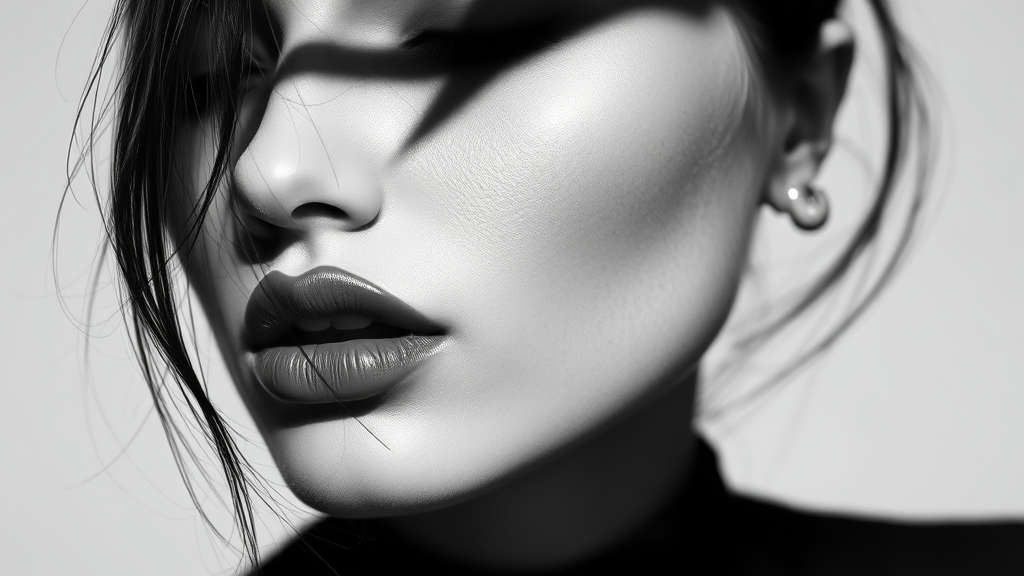 A captivating black and white portrait of an alluring woman, her lips prominently featured and partially enveloped in deep shadows; designed for a fashion or advertising cover. The image is high contrast, exuding a sense of minimalist elegance and modern mystery. With its artistic and iconic design, the photograph is both stylish and simple, yet profoundly beautiful and powerful, embodying a striking sense of allure in its minimalist style.