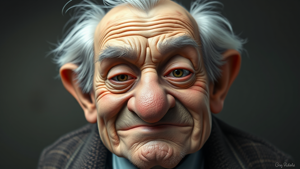 A captivating caricature in Pixar-inspired style depicting a whimsical, mischievously annoyed elderly gentleman with pronounced wrinkles, portrait, cartoon art style trending on ArtStation, precise focus, studio lighting, elaborate textures, intricately detailed, by Greg Rutkowski, with a hint of playfulness in his squinted eyes and a subtly raised eyebrow suggesting he's cooking up some clever scheme.