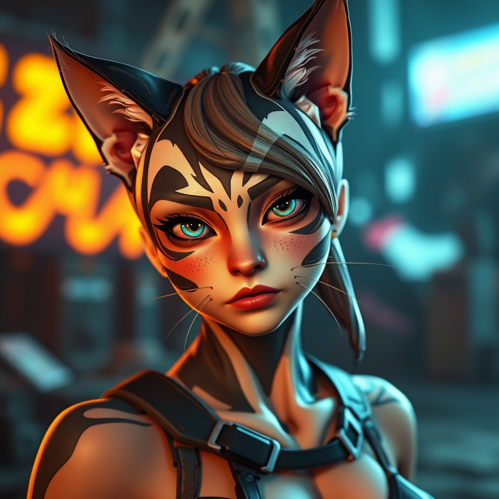 A captivating cat girl character inspired by the artistry of Yoji Shinkawa and Guweiz, captured in the vibrant style of Borderlands with the realism of Unreal Engine and Octane Render. The scene features depth of field, 8K UHD resolution, and cinematic lighting with ray tracing for dramatic effect. The focus is on a charming expression and graceful proportions, set against a dynamic backdrop that highlights sleek outlines and intricate textures. The design avoids negative aspects like blurriness, deformations, and anatomical inaccuracies, ensuring a flawless and immersive visual experience with a touch of creative flair.