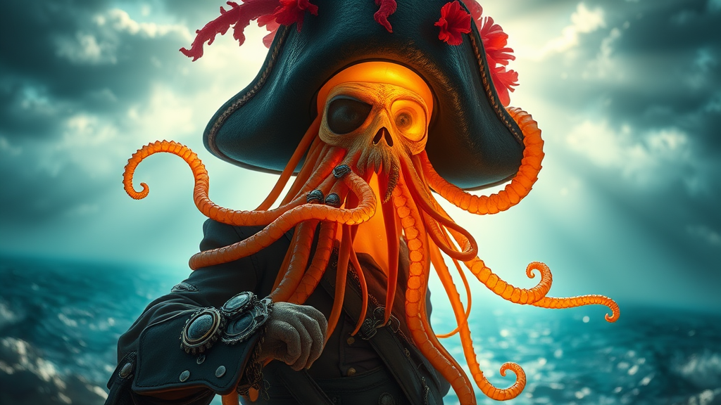 A captivating character portrait of an anthropomorphic jellyfish pirate, featured with a proud pose. The scene is beautifully backlit, allowing light rays to cascade through the translucent tentacles, creating a mesmerizing effect. The pirate is adorned with intricately detailed, ocean-themed pirate attire, complete with barnacle-encrusted accessories and a coral-adorned hat. The highly detailed textures emphasize the jellyfish’s ethereal glow, while a backdrop of a misty sea and a stormy sky adds drama and depth. This striking image reflects a unique blend of marine life and swashbuckling adventure, capturing the imagination in a composition that exudes adventure and mystery, trending as a standout piece on art platforms.