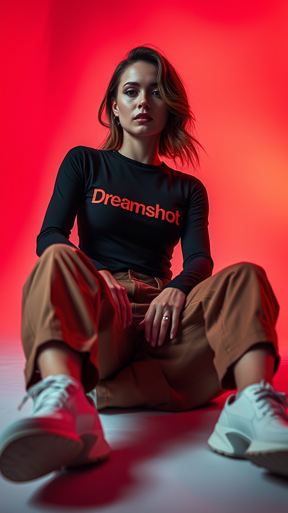 A captivating, cinematic fashion photograph featuring a woman confidently seated on the floor, embodying the essence of the Dreamshot brand. She wears a sleek, high-performance Dreamshot heattech top adorned with bold "Dreamshot" lettering, paired with stylish brown chinos. The shot is captured from a wide, low angle, enhancing the dramatic and dynamic aesthetic. The studio backdrop offers a mesmerizing gradient blend of red, pink, and orange hues, creating a warm, ethereal atmosphere that perfectly complements the model's attire and the brand's innovative spirit. Subtle shadows and highlights add depth, emphasizing both the clothing's texture and the overall composition's artistic quality.