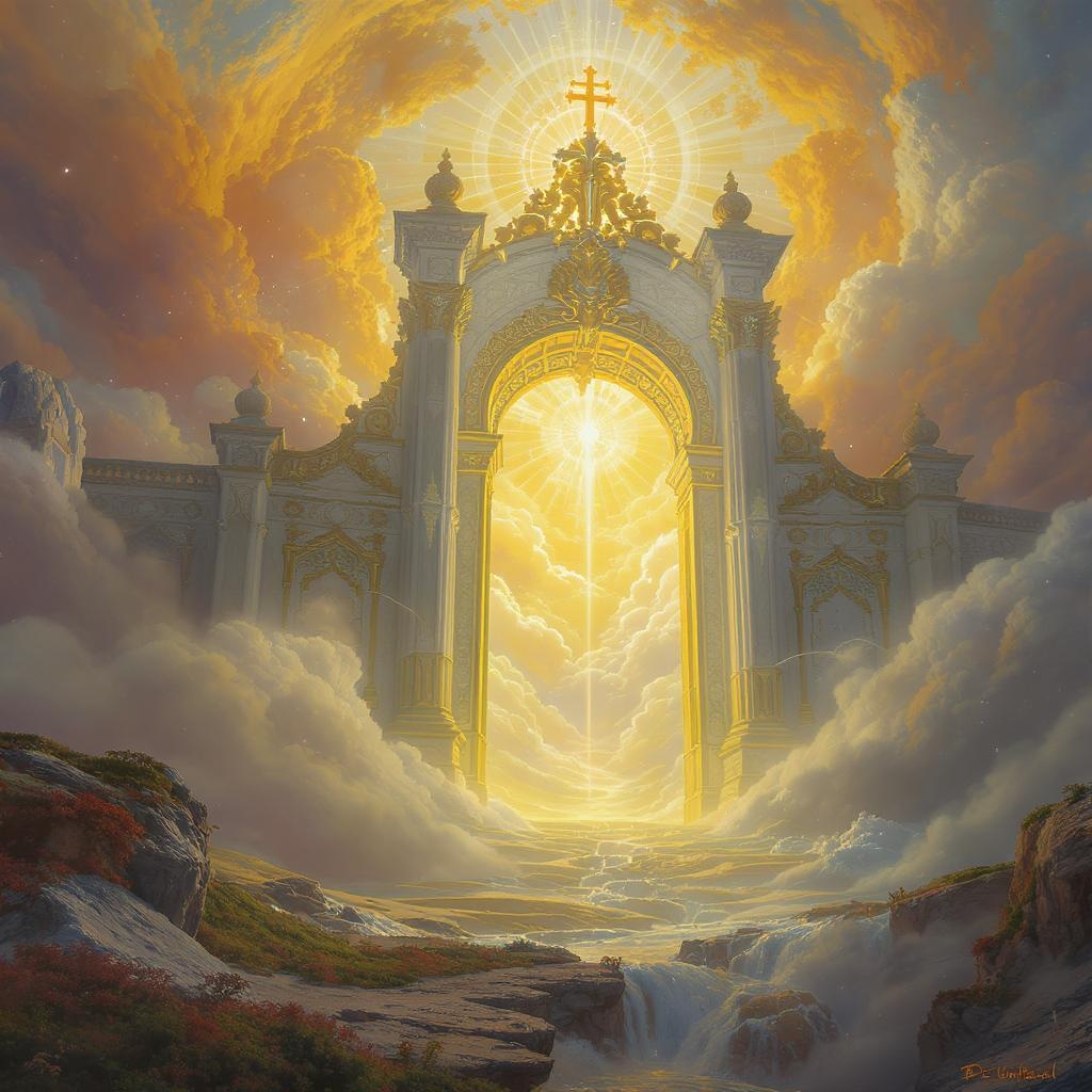 A captivating cinematic shot of the majestic gates to heaven, rendered in full 8k detail with exquisite realism. The scene is imbued with an atmospheric quality reminiscent of Ivan Aivazovsky's ethereal landscapes, Peter Mohrbacher's imaginative visions, and Greg Rutkowski's detailed artistry. A beautiful interplay of volumetric light bathes the celestial entrance in a broad, heavenly glow. The composition echoes the richness of an oil painting, blending elements of fantasy art with a sci-fi aesthetic. This visual is crafted with a realism that brings the divine setting to life, like a premium print interpreted through the lens of an unreal engine.