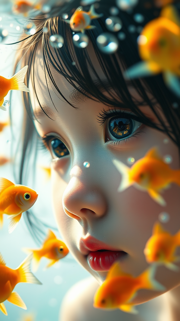 A captivating close-up of a cute girl with vibrant, brightly colored fish swimming around, her eyes reflecting a dreamy, ethereal quality. Half of her face is immersed in water, reminiscent of a Makoto Shinkai scene, with a nod to Otomo Katsuhiro's style. The perspective is exaggerated, offering a hyper-detailed, realistic render with a glowing yellow-and-blue palette. Brushstrokes mimic hyper-realistic oil painting, showcasing the Tyndall effect with water droplets cast in mother-of-pearl iridescence. The scene is set against a holographic white and green background, bringing an enchanting, immersive feel to the composition.