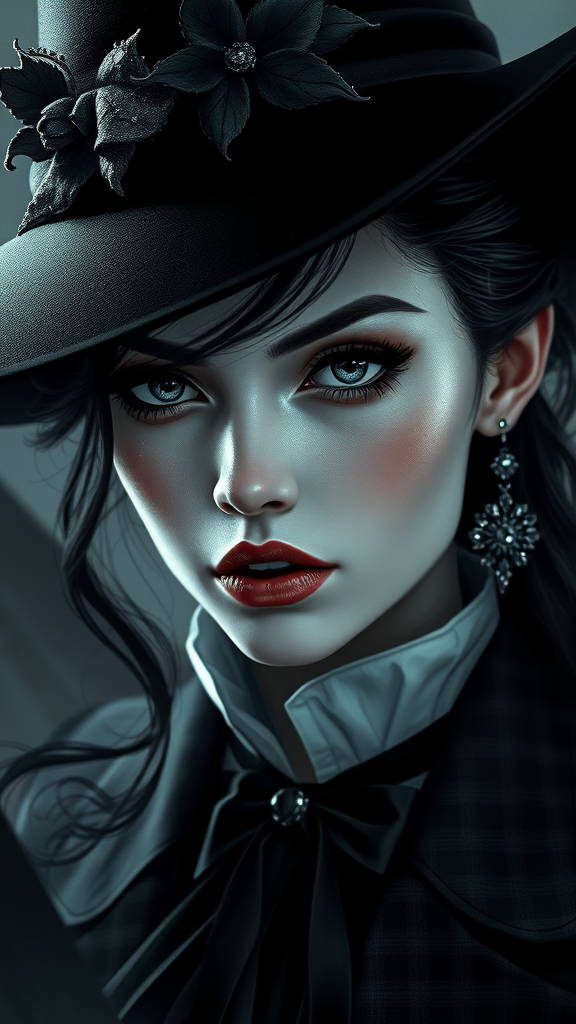 A captivating close-up of a woman dressed in a sophisticated black and white ensemble, embodying the allure of a fashionable dark witch. Her striking presence is captured in a digital artwork inspired by the distinct styles of WLOP, Guweiz, and Loish. Her visage holds an air of mystery, with intricate details highlighting her enigmatic expression. The portrait exudes gothic horror vibes, showcasing her as a gothic girl with elements of elegance and dark fantasy. Her eyes, deep and haunting, reflect the shadowy allure of a dark witch character, surrounded by an aura that hints at untold spells and secrets. Subtle yet creative embellishments enhance this bewitching vision, staying true to the core themes of intrigue and mystique.