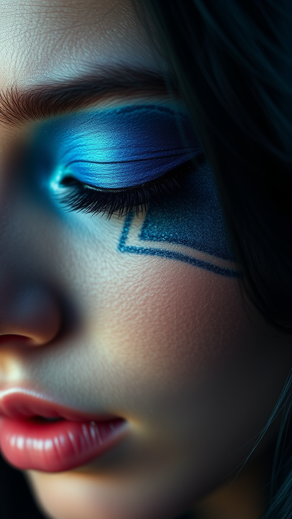 A captivating close-up of a woman with vibrant blue eye shadow, reminiscent of a Dior editorial, gaining popularity on Pinterest. Her eyes are gently closed, showcasing an exquisite smoky and dreamy effect with stunning gradient colors. Her face, pretty and oval-shaped, begins a mesmerizing transformation into a werewolf, creating an entrancing aesthetic. The scene channels the essence of Muqi, and is currently trending on Tumblr. The right eye area is flawlessly clear, contributing to the overall ethereal beauty, with an aspect ratio of 3:5, heightened by a raw, stylized touch.