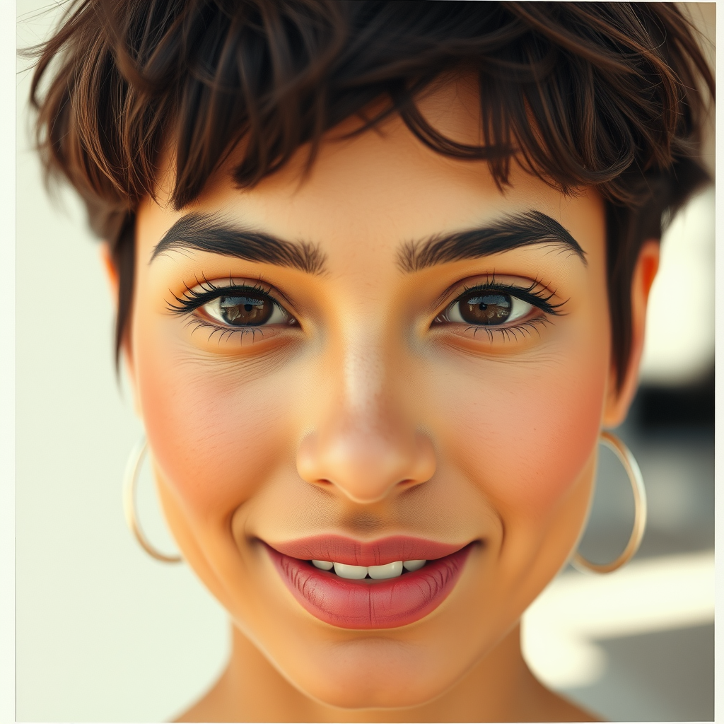 A captivating close-up polaroid of a 24-year-old Mizo-Lebanese woman exuding an exotic allure with her warm and approachable expression. Her medium-tan skin glows with a touch of olive, reflecting a sun-kissed radiance. She wears minimalist makeup, a subtle blush graces her cheeks, and her lips are painted a natural pink hue, while her skin's pores and texture are prominently detailed. Her unique octagonal-shaped, deep chestnut eyes, framed by graceful, lengthy lashes, add depth to her gaze. Her hair is a shaggy bob with a naturally tousled texture, and her impeccably shaped eyebrows enhance her refined features.