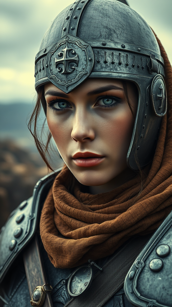 A captivating close-up portrait of a female knight templar on a crusade, centered and intricately detailed. She exudes breathtaking beauty, reminiscent of a cinematic masterpiece infused with the essence of Karol Bak's artistry. Her determined gaze and expertly crafted armor reflect her valor and dedication. The background subtly highlights a medieval landscape, enhancing the historical allure. The image embodies grace and strength, free from imperfections or distortions, perfectly capturing the noble spirit of the crusading knight.