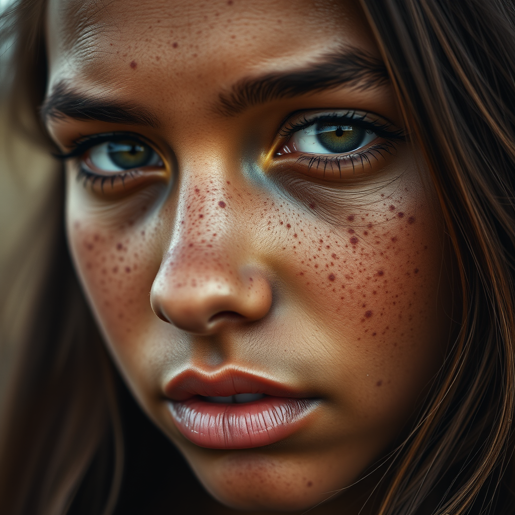 A captivating close-up portrait of a freckled young woman, her brown skin rich and textured like fertile soil, embodying the hyperrealism reminiscent of Antoni Pitxot's work. Her timid and vulnerable expression adds depth and emotion, perfect for an epic music album cover. Inspired by Albert Watson and Graham Humphreys, the composition is expertly crafted with smooth shading and charcoal tones, showcasing the unique beauty of this teen-aged girl.